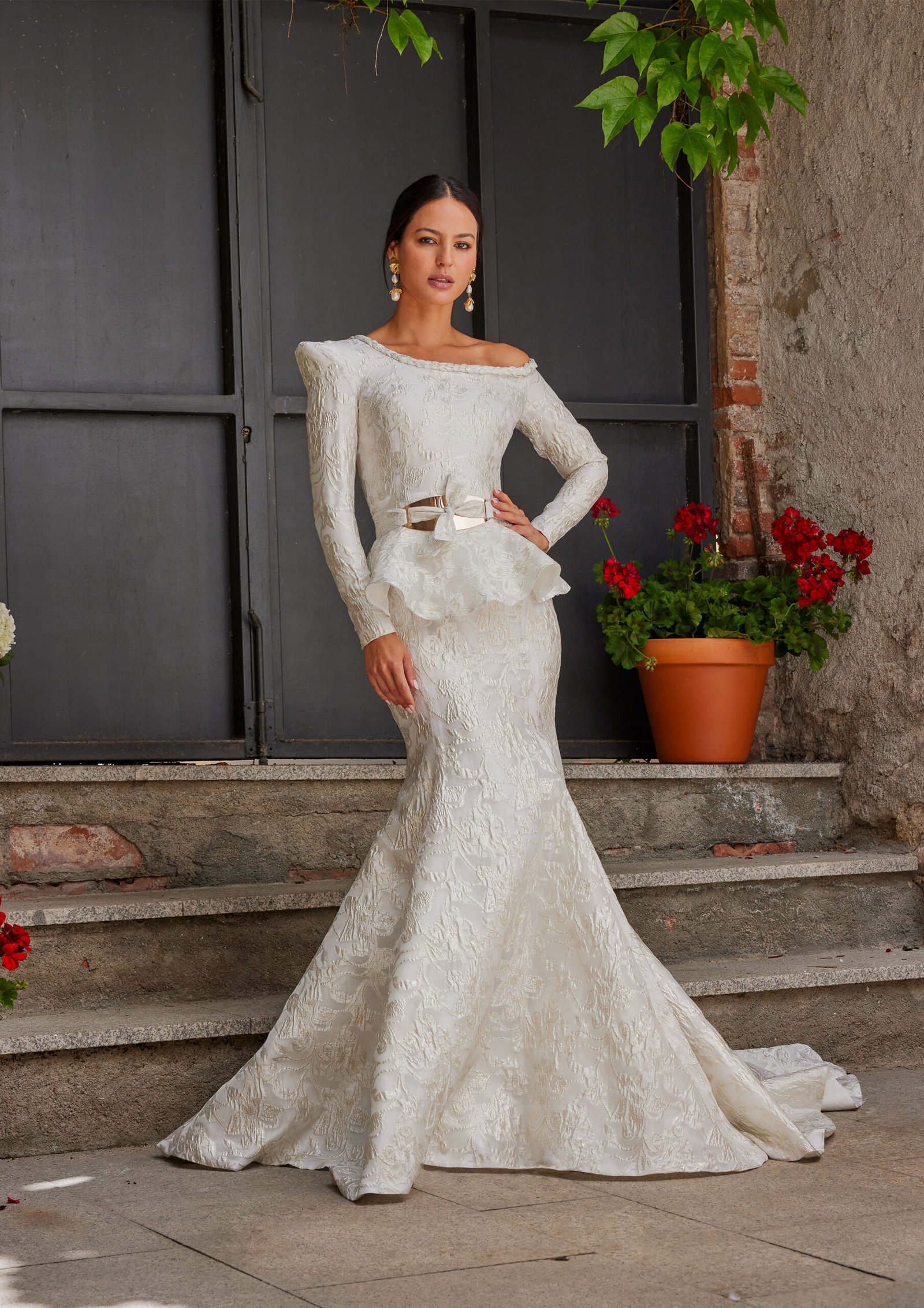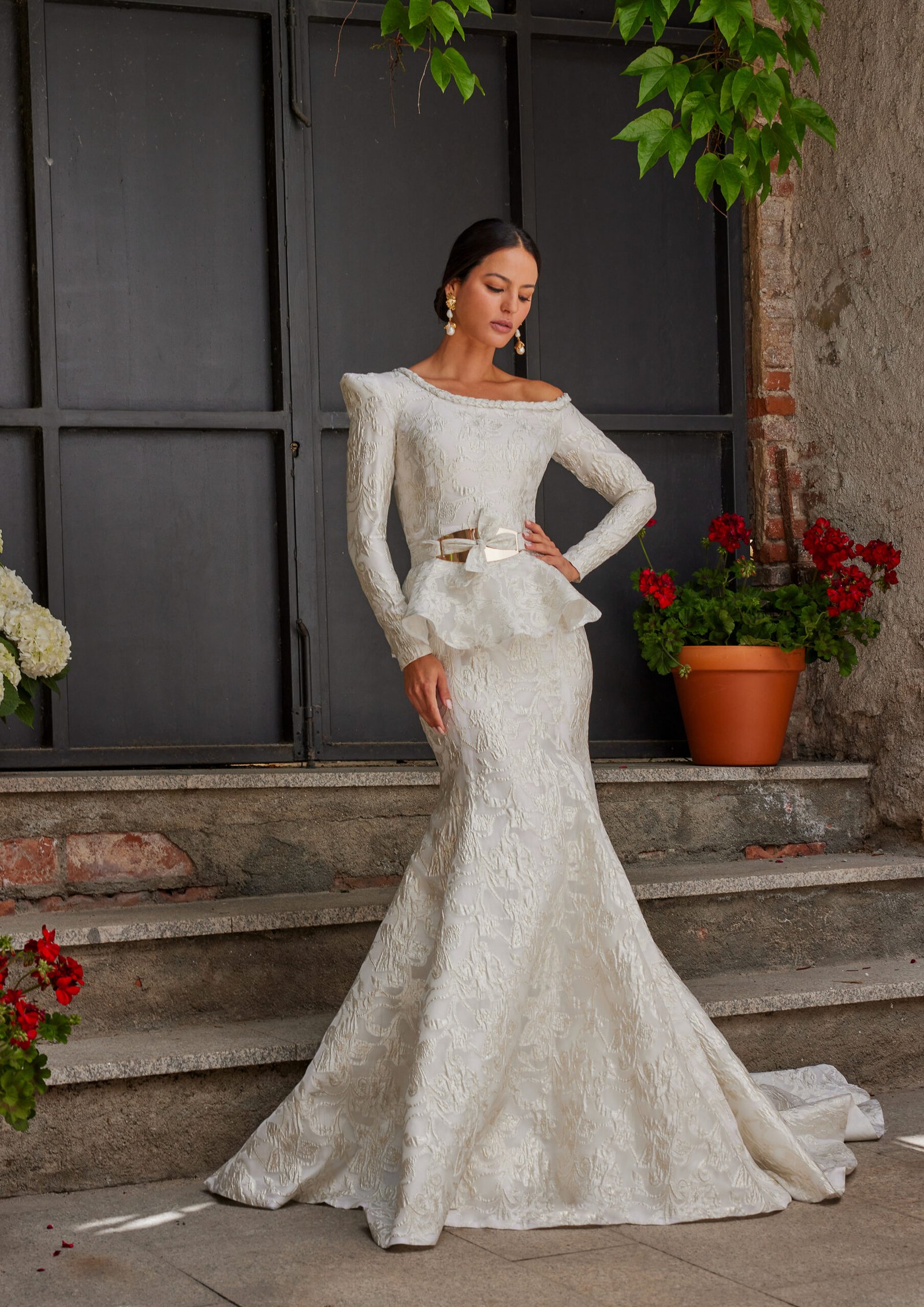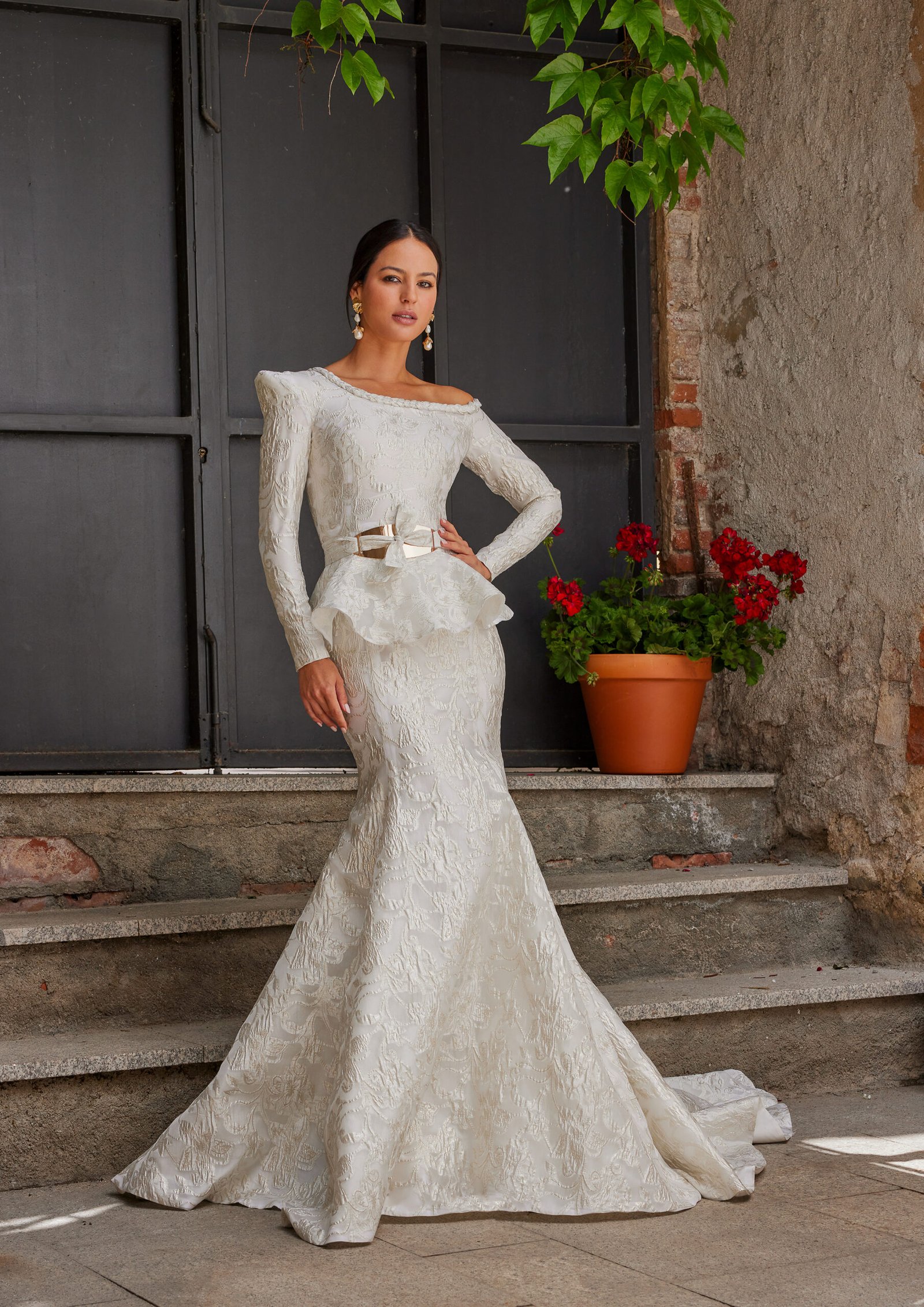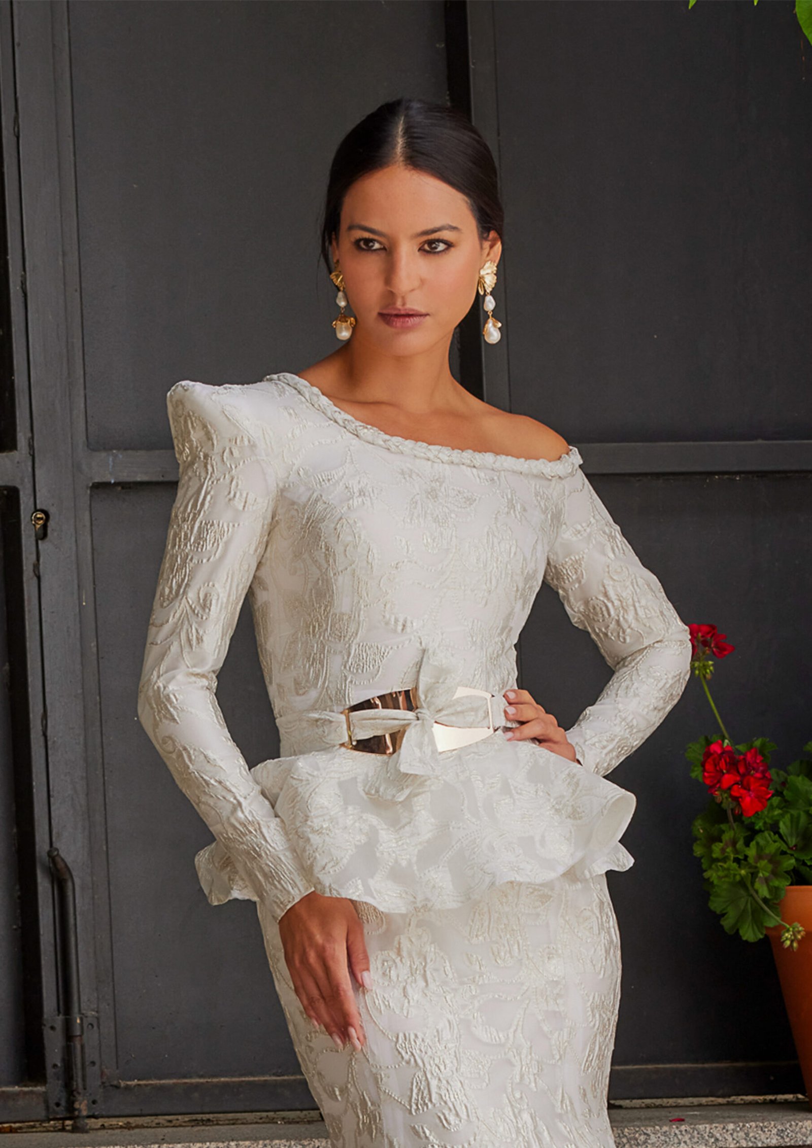 Este impresionante vestido de novia de corte sirena realza la figura con una silueta ceñida que se abre en un elegante final. El escote asimétrico y el cinturón efecto peplum aportan un toque moderno y sofisticado. Confeccionado en organza deboré, el vestido ofrece una textura sutilmente rica y delicada. El detalle de trenza hecha a mano en el escote añade un toque artesanal y único, haciendo de este diseño una elección inolvidable para novias con estilo.
