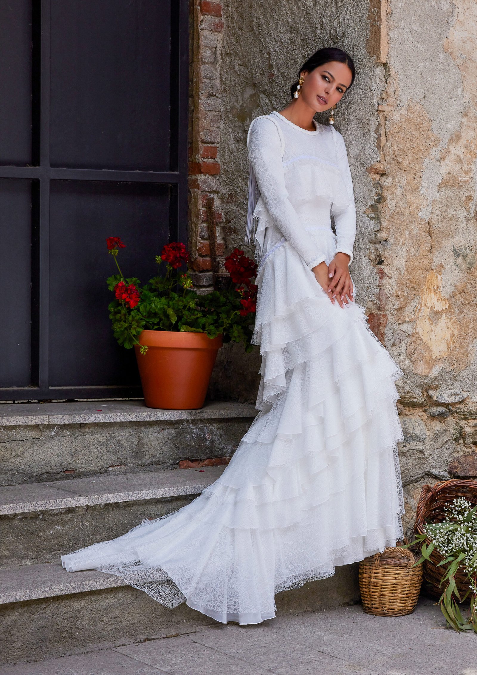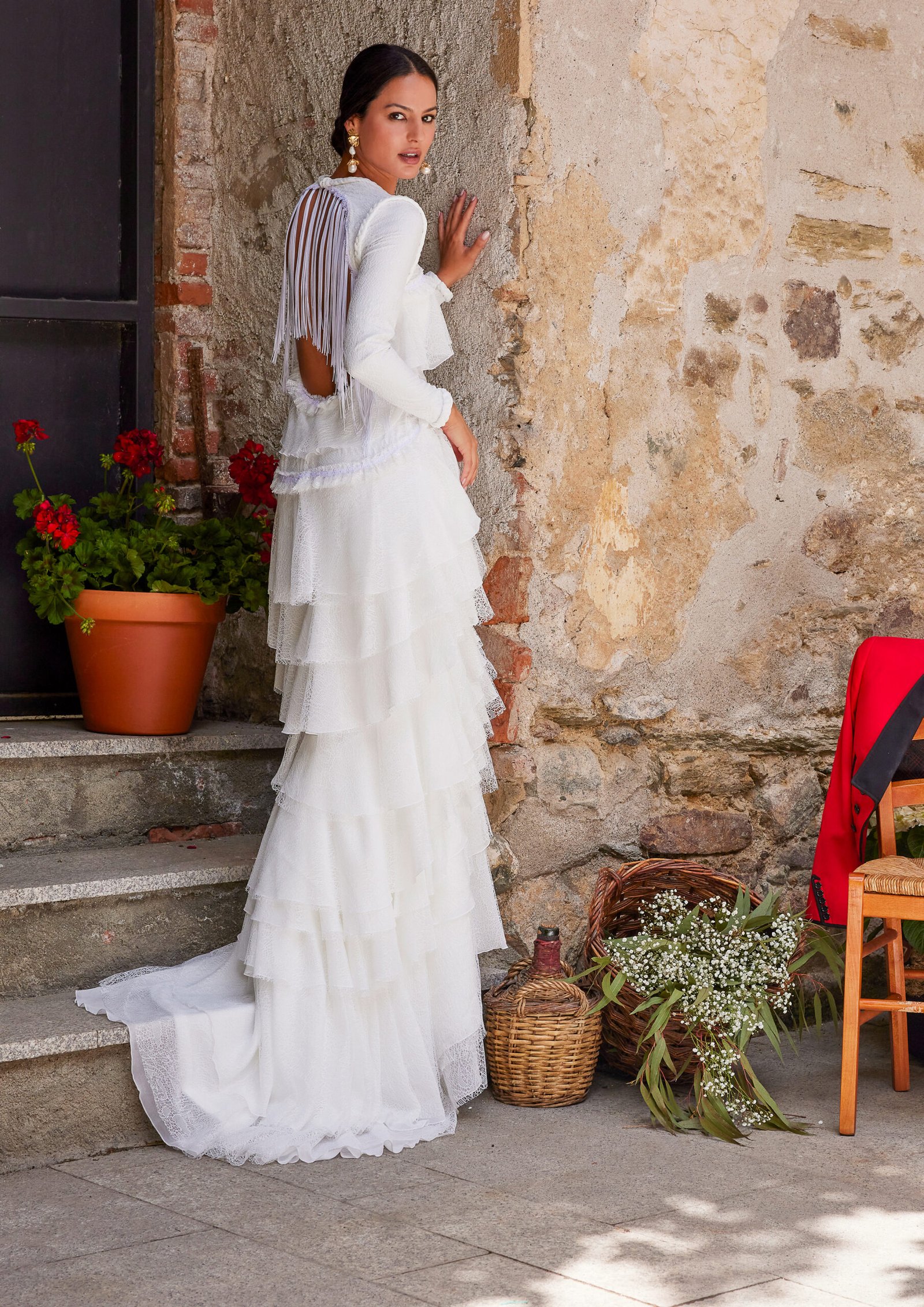 Este espectacular vestido de novia de corte sirena resalta la figura con una silueta ajustada que termina en una abertura dramática en la espalda, completamente al aire. Confeccionado en chantilly y encaje, el vestido está lleno de volantes que aportan movimiento y una textura delicada. Los flecos en la abertura de la espalda añaden un toque bohemio y sofisticado, mientras que las mangas largas equilibran el diseño con elegancia. Un vestido romántico para una novia que quiere destacarse por su estilo único y atrevido.