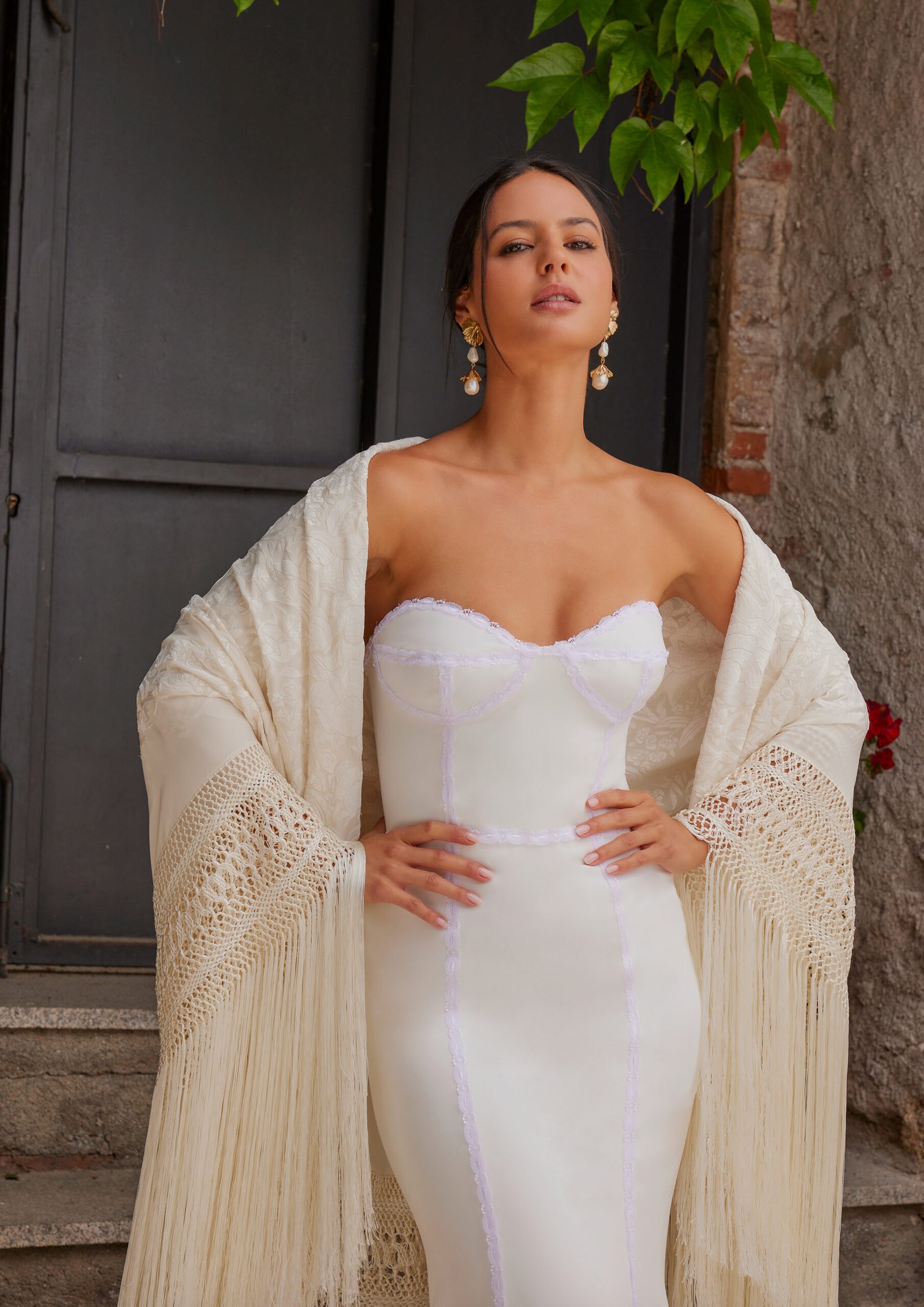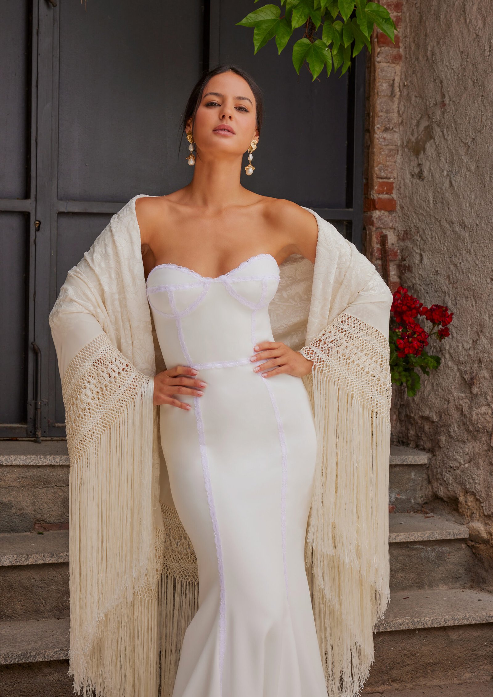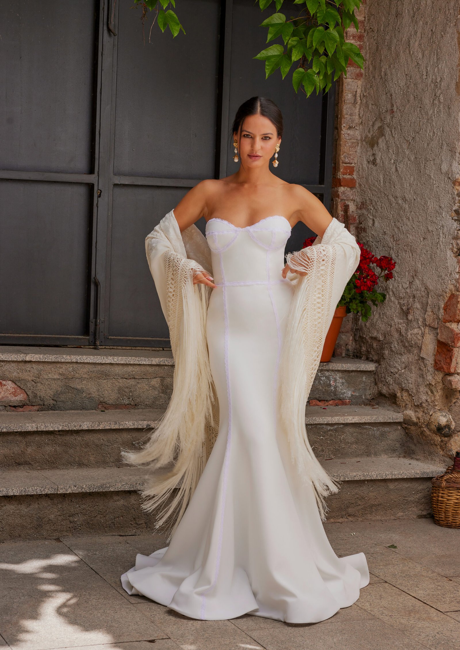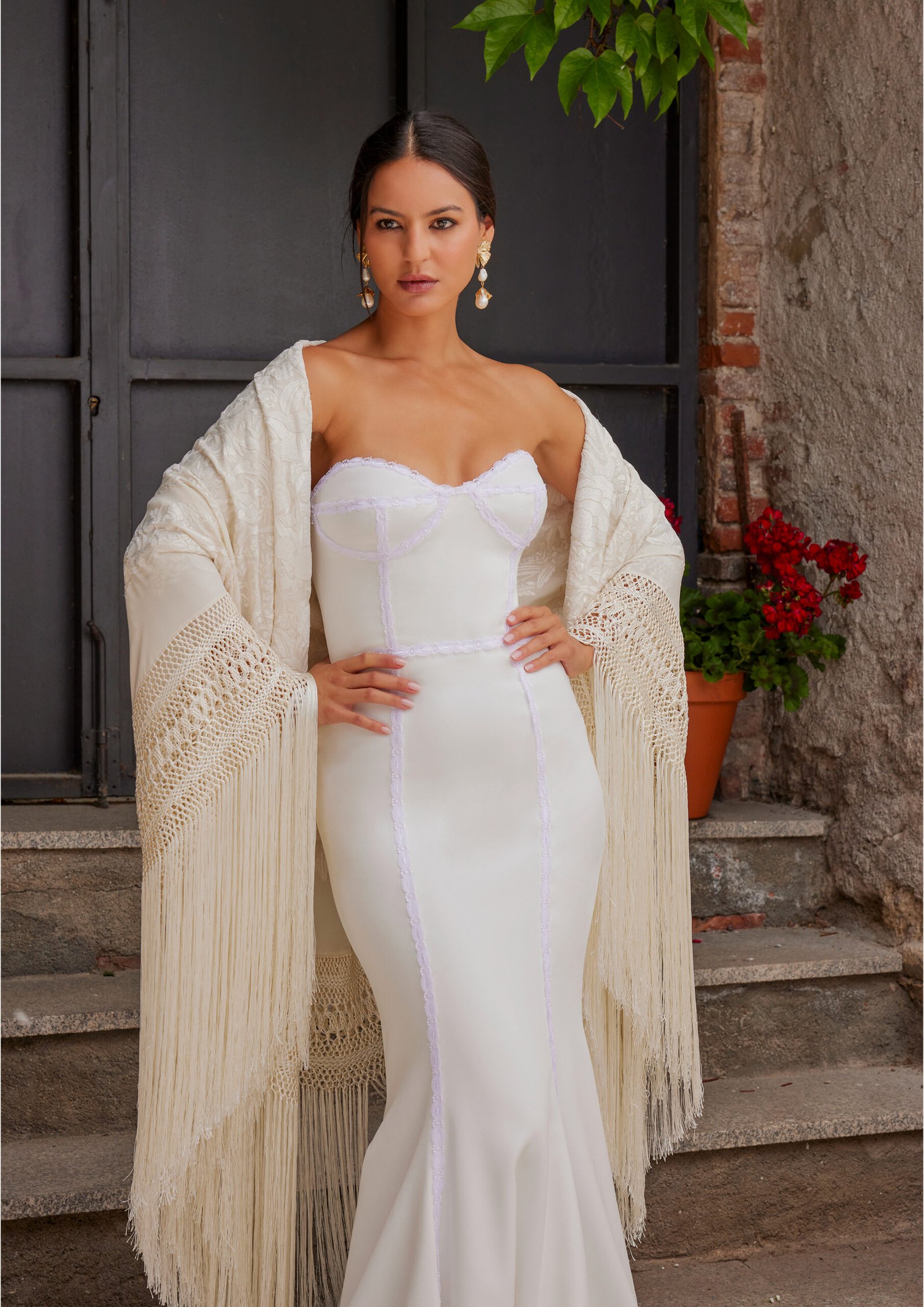 Este elegante vestido de novia de corte sirena resalta la figura con su diseño ceñido, terminado con un escote palabra de honor que aporta sofisticación y sensualidad. Confeccionado en crepé pesante, ofrece una caída impecable y un ajuste perfecto. El toque único lo dan las tiras hechas a mano de guipur, que rematan el vestido con un detalle artesanal y delicado, creando un look sofisticado y atemporal.